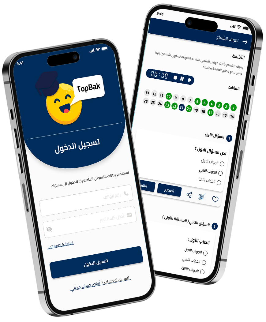 توب-باك هو تطبيق تعليمي مبتكر يهدف إلى تمكين الطلاب من تحقيق أعلى مستويات التفوق الأكاديمي. نسعى لتوفير أدوات تعليمية متطورة تجعل التعلم أكثر سهولة وفاعلية، بفضل فريق عمل متخصص وخبرة تمتد في مجال تطوير الحلول التعليمية الرقمية.